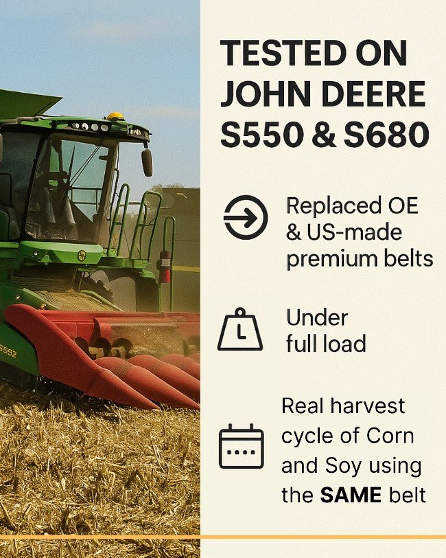 Our Movendis PowerPlus belts went head-to-head with real harvesting conditions on John Deere S550 and S680 combines during a full corn and soybean harvest — using the same belt throughout the season.